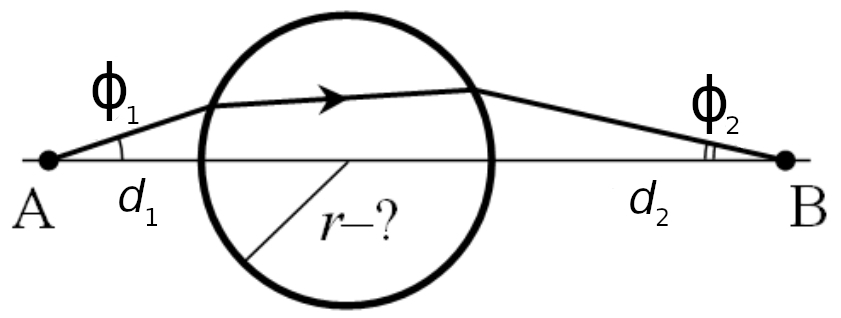 | Точечный предмет A расположен на расстоянии $d_1$ от поверхности прозрачного шара, а его действительное изображение в этом шаре B – на расстоянии $d_2$ от поверхности шара. Найти радиус шара $r$, если известно, что луч, исходящий от предмета под малым углом $\phi_1$ к прямой AB, выходит из шара под углом $\phi_2$ к этой прямой. |