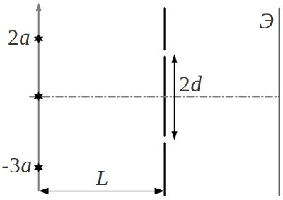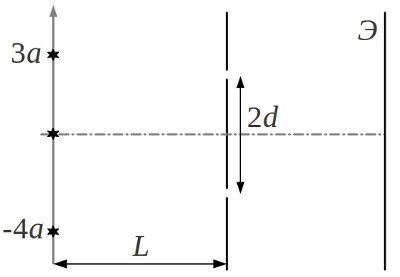 третий ниже центральной линии на расстоянии $4a$ (см. рис., $L\gg a$). Найти, при каком минимальном $d$ интерференционные