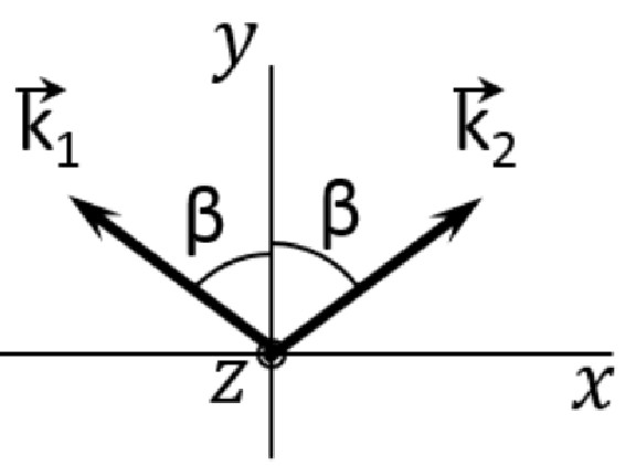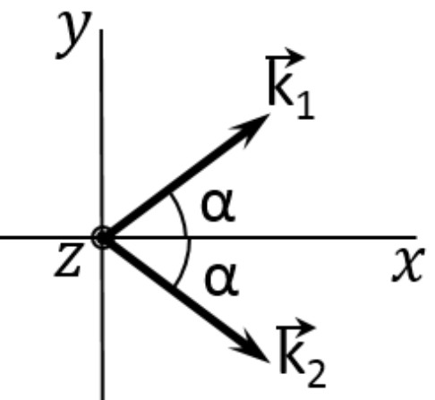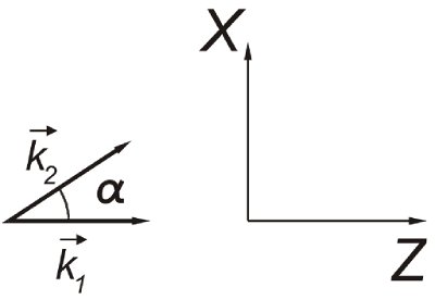 Эллиптически поляризованные волны с волновыми векторами $\vec{k}_{1}=k\vec{e}_z$, $\vec{k}_{2}=k\cos\alpha\vec{e}_z+k\sin\alpha\vec{e}_x$ соответственно