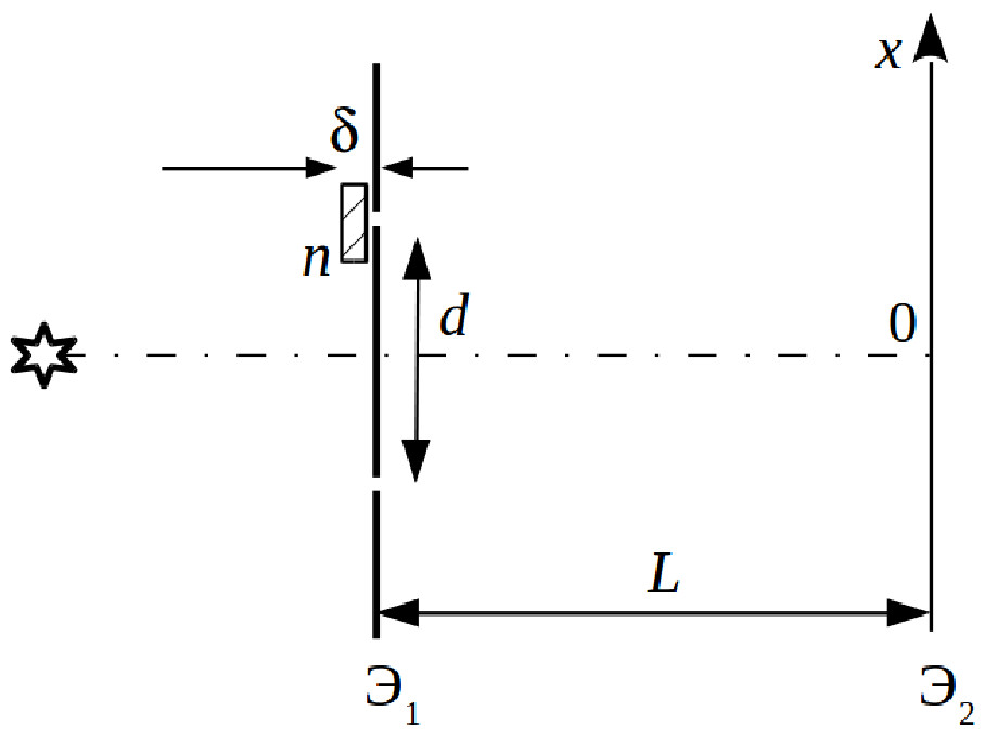| В классической схеме Юнга экран $Э_1$ с двумя щелями освещается монохроматическим нитевидным источником с длиной волны $\lambda$.
