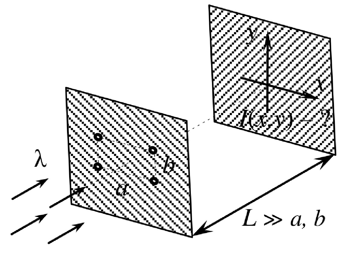 $L \gg a,\, b$ от экрана-ширмы, наблюдается интерференционная картина.