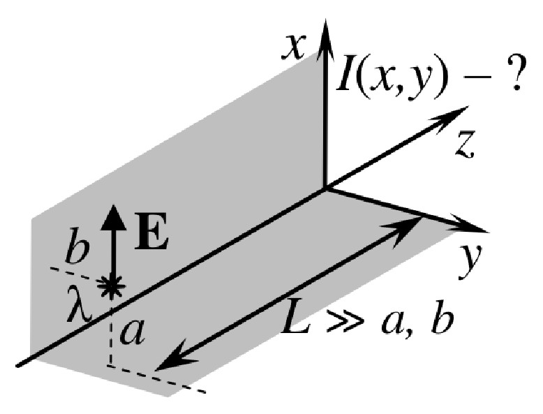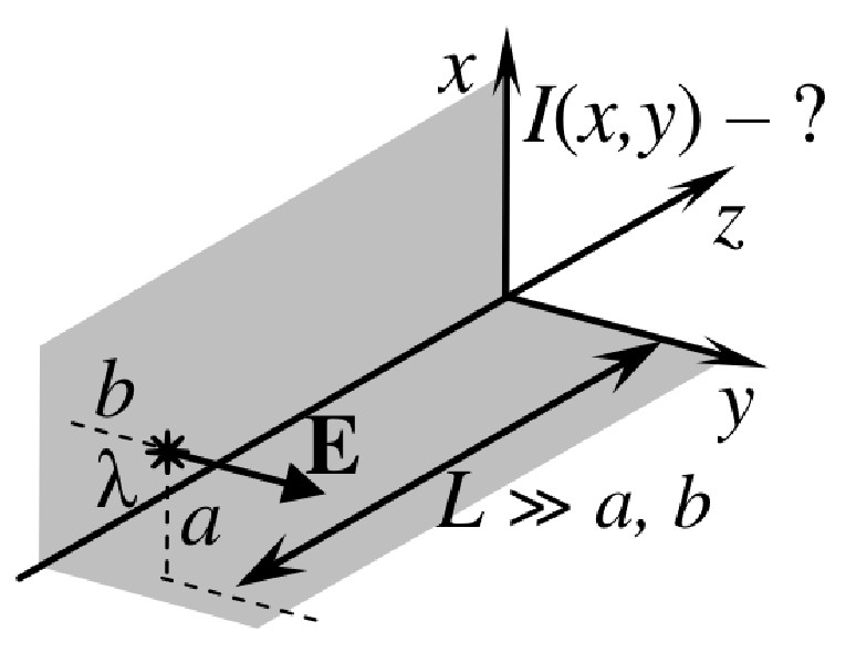 | Нитевидный монохроматический источник с длинной волны $\lambda$ расположен перпендикулярно оси $z$ (см. рис.).