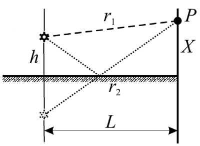 | Найти интерференционную картину $I(x)$, создаваемую точечным монохроматическим источником (длина волны $\lambda$), помещенным в фокус зеркала,