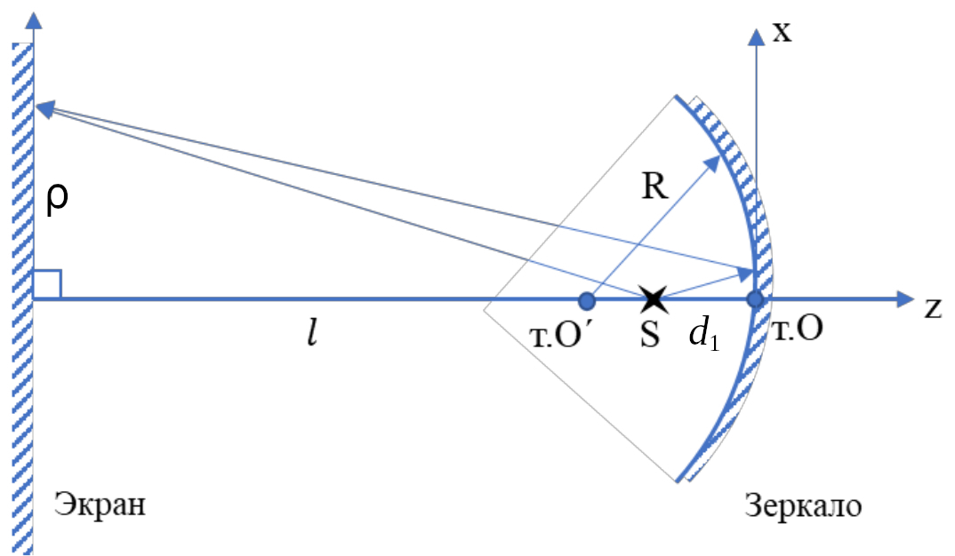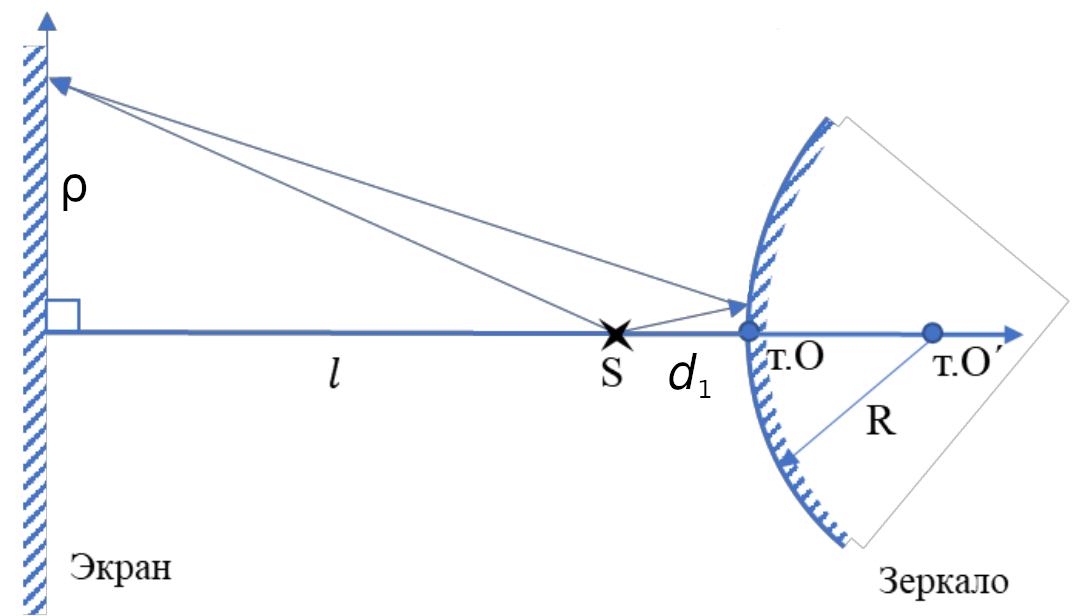 в результате интерференции волн от точечного монохроматического источника S с длиной волны $\lambda$, расположенного на расстоянии $l$ от экрана и на расстоянии $d_1$ от поверхности выпуклого сферического зеркала радиуса $R$. |