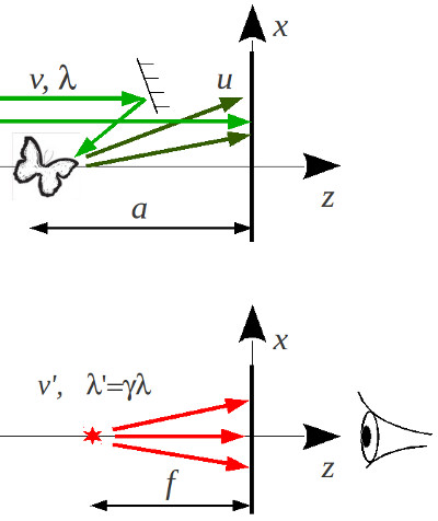 № 209). Но тогда становится понятно, как устроена волна справа от голограммы (при $z>0$): так же, как справа от линзы, на которую падает волна $u(z,t)$, рассеянная от предмета. Наблюдатель будет видеть изображение предмета, положение которого определяется по правилам геометрической оптики.