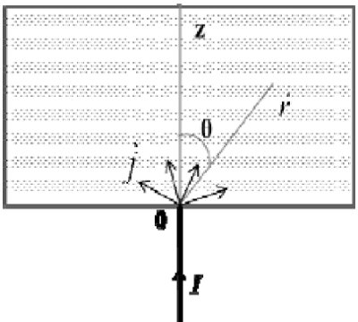 | Прямой полубесконечный провод с током $I$ входит по нормали в проводящее полупространство $z$>0, в котором
