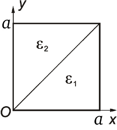 В области диэлектрика $\varepsilon_1$ распределение потенциала известно: $\varphi_1(x,y)=\varphi_0\frac{ (a-x)y}{a^2}$,