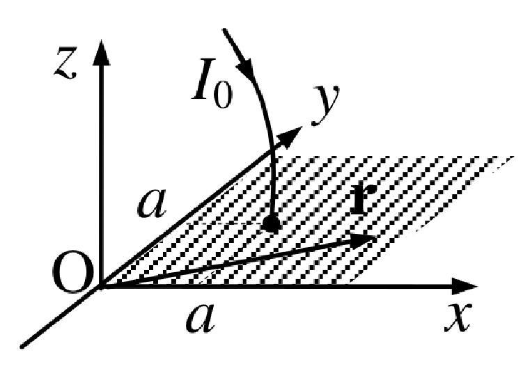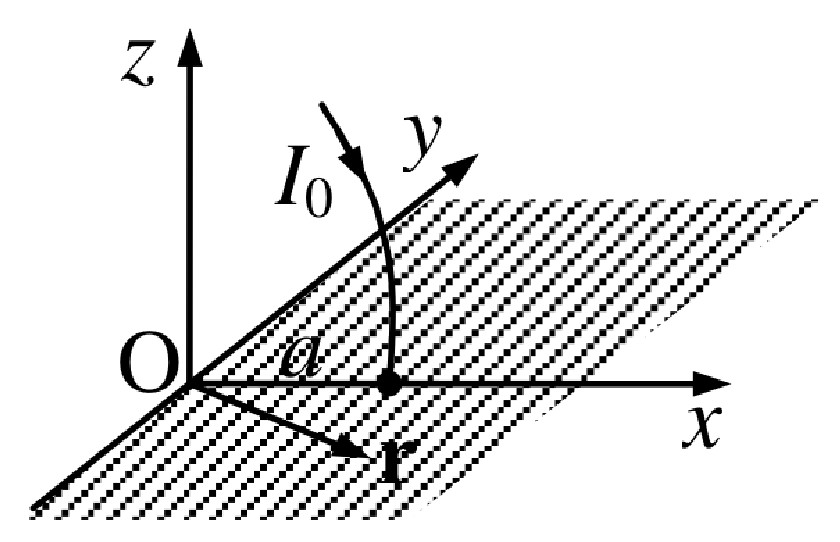 | Конец провода, по которому течет ток $I_0$, касается тонкой однородной проводящей поверхности, занимающей область $z = 0$, $x\geq 0$, $y \geq 0$ в точке, равноудаленной на расстояние $a$ от ее краев. Найти распределение