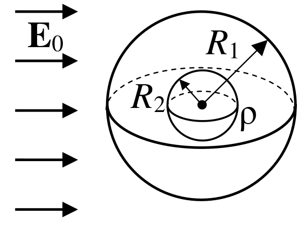 поле $\vec{E}_0$. В центре оболочки находится непроводящий шар