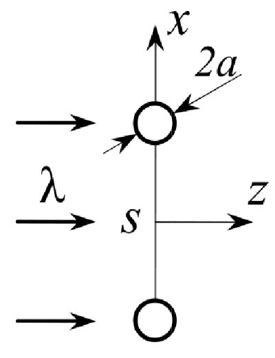 друг от друга ($s\gg a$). На шарики вдоль оси $z$ падает плоская монохроматическая световая волна с длиной