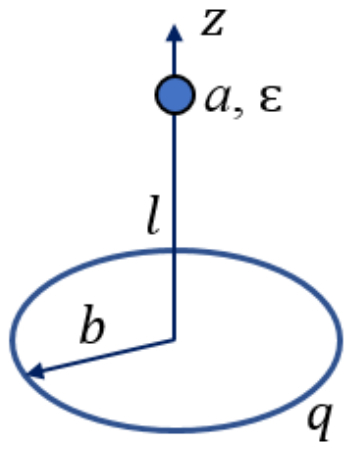 радиуса $a$ с проницаемостью $\varepsilon$, расположенного на оси кольца на расстоянии $l$ от его центра. При этом считать, что $a\ll l,b$. |